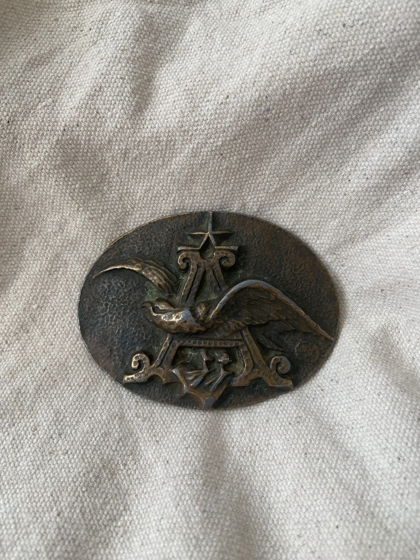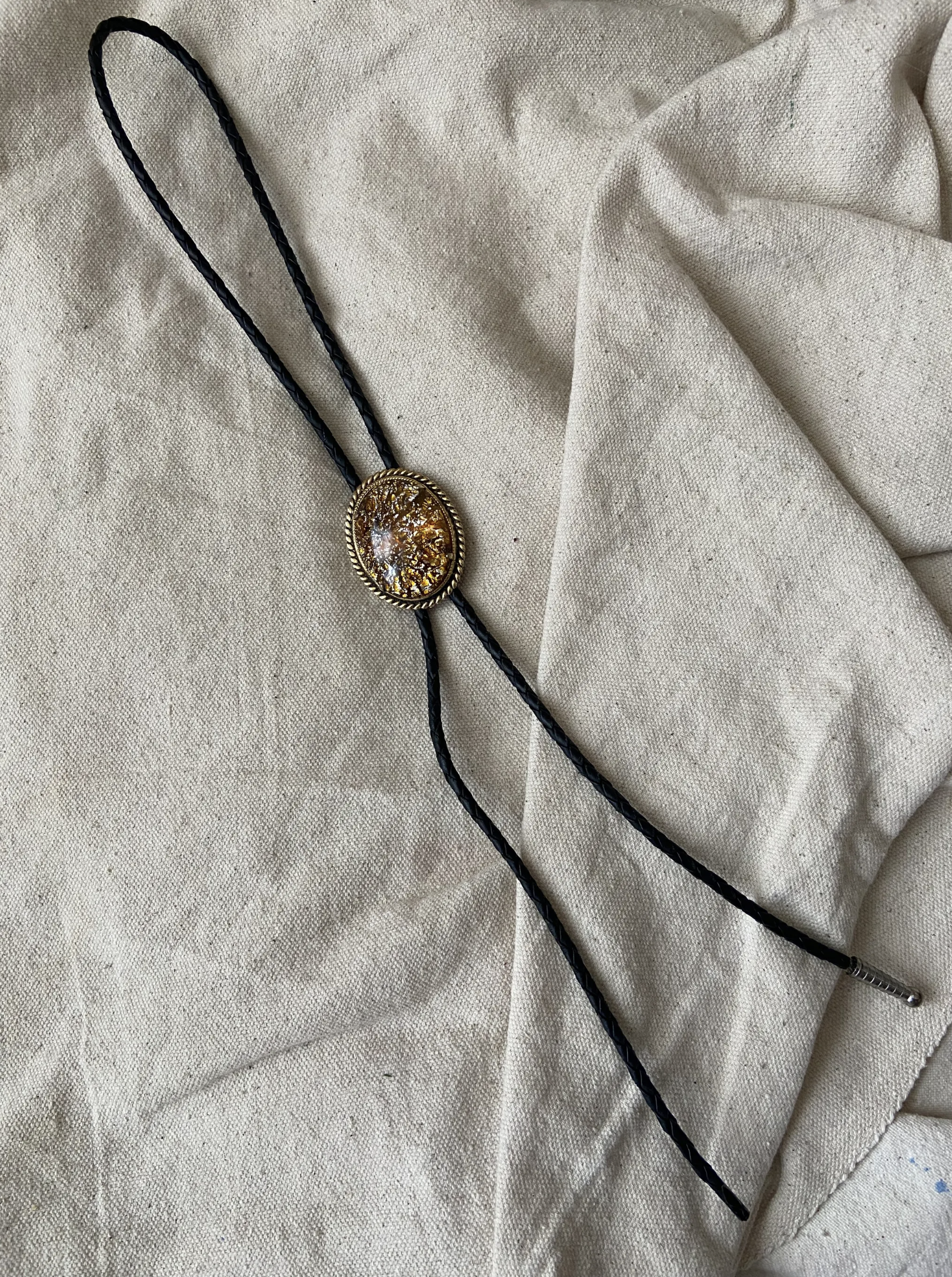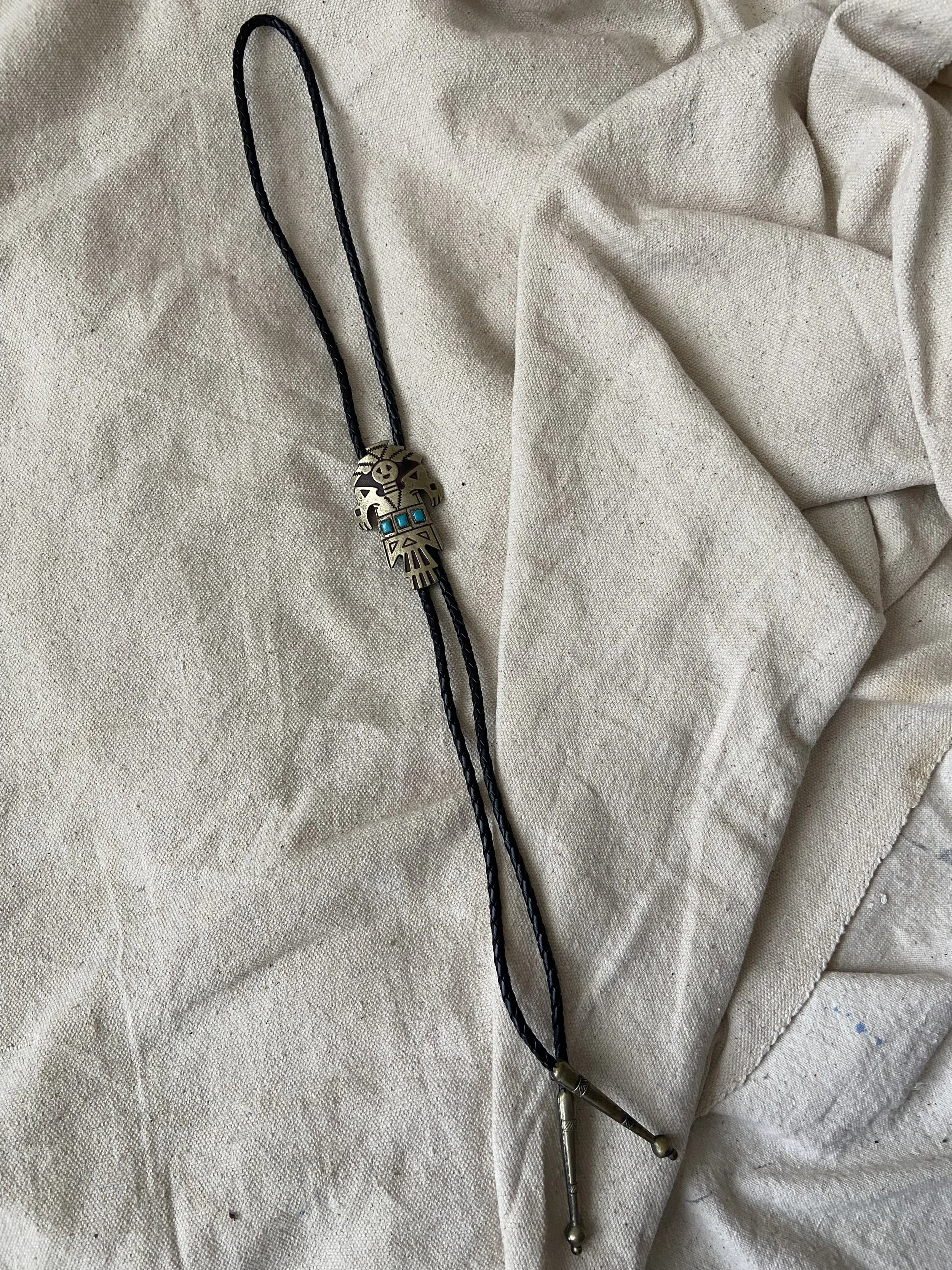 Saddle bolo tie with chrome steel and braided nylon band. One size fits all.
